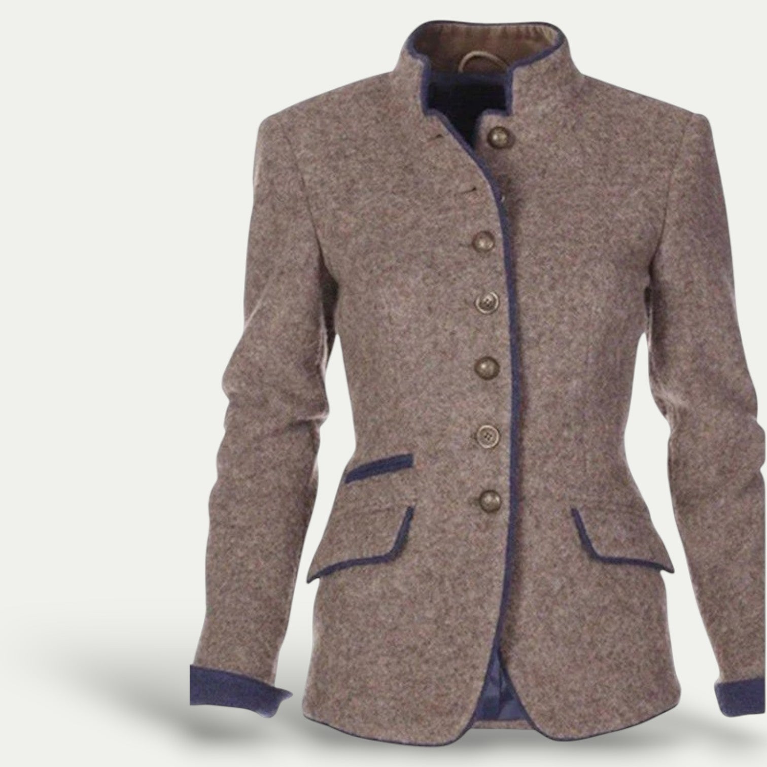 Moderne Silhuett: Med en buet nederkant og skrå klafflommer skaper denne blazeren en stilfull silhuett. Kontrastpipingen gir et preg av sofistikering, noe som gjør den perfekt for smart casual antrekk.